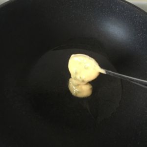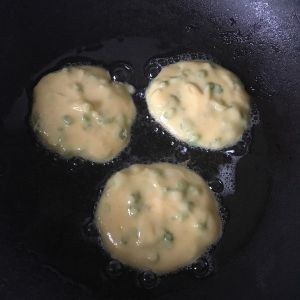 锅中放入油,中火加热,等油热后挖一勺子面糊放入锅中
