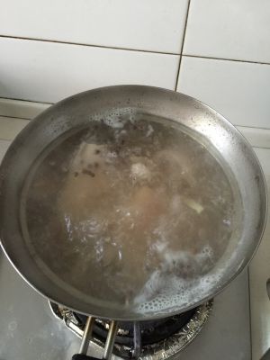 将五花肉清洗干净,冷水放入锅中煮,锅里加老姜三片,花椒十几颗,黄酒一调羹煮十五分钟,筷子插进去未见血水出来即可捞出晾凉