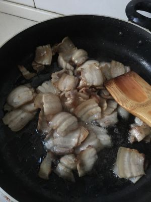 炒锅烧热,倒油煸炒肉片,这一步忘记拍照了,哈哈。肉片炒至微卷即可捞出备用,这时可以炒出一些猪油,如果油太多可以倒掉一些,留底油放入花椒,葱姜蒜,加入郫县豆瓣和黄豆酱炒出香味。