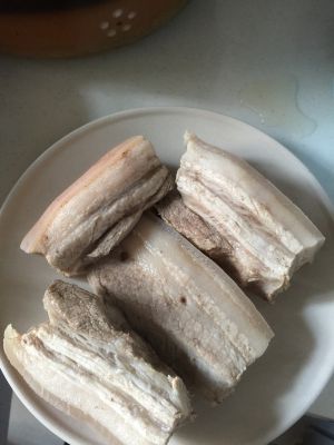 五花肉在水里煮15分钟,水里加花椒和料酒,筷子能插透即可,捞出凉水过一下捞出切片。