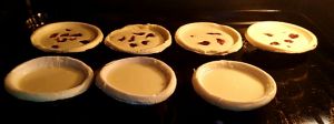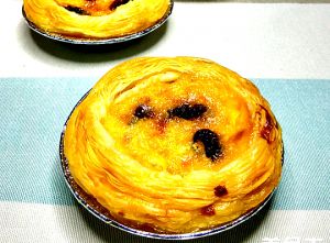 在表面洒少许蔓越莓粒,入烤箱中层,上下火,200度,20分钟左右,蛋挞液表面稍稍出现焦痕即可