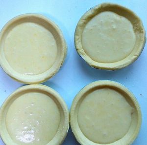 将蛋挞液过滤,倒入蛋挞皮约八分满