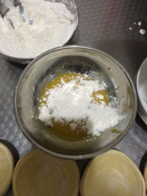 蛋黄打散 将面粉倒入蛋黄中 搅拌均匀 注意不要有细小颗粒