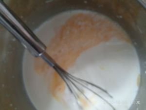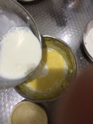 将拌好的奶油和纯奶慢慢倒入加了面粉的蛋黄中 搅拌均匀