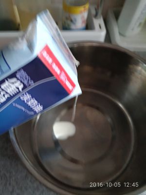 将纯奶倒入准备好的淡奶油中 加糖 边倒边搅拌