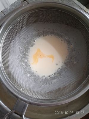 几分钟后搅一下,用过滤网过滤一下,没有过滤网的,用筷子把鸡蛋液上面那层气泡刮掉