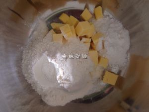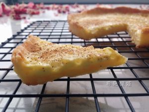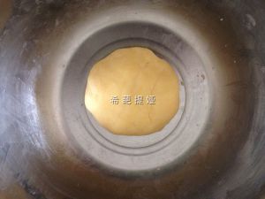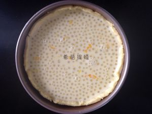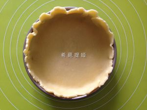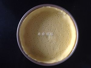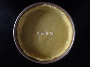 将面团擀薄,铺在6寸圆形模具中,不是不粘模具的话,需要把模具涂上黄油,不粘模具直接放入面皮。