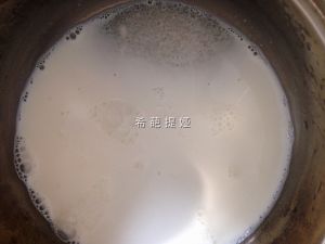 剩余的细砂糖和盐倒入牛奶和淡奶油的混合液中,隔水煮至糖融化。
