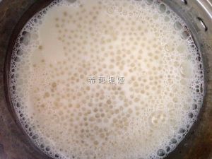 慢慢倒入蛋液中,中途要不停的搅拌。将混合好的布丁液过滤后备用。