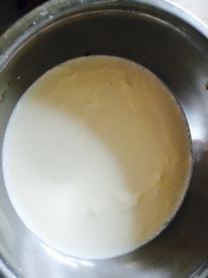 将牛奶、淡奶油、白砂糖入锅加热,砂糖全部融化即可,不必煮开。冷却后加入蛋黄,蛋黄提前打散 (我第一次就煮的有些过,冷却后结了一层奶皮,会影响蛋挞水口感,于是被我吃掉了,很香甜的说。)