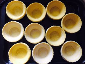 从冰箱拿出蛋挞皮,稍微放温一点。