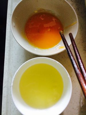 蛋黄放碗里单独打散,然后倒入搅拌均匀的液体容器盆中继续搅拌,直到没有颗粒和不均现象。烤箱预热。把蛋液倒入蛋挞皮中,倒8分满即可。
