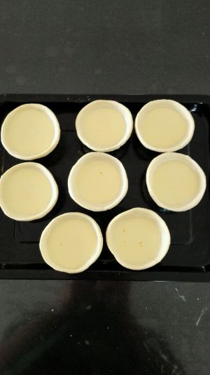 过滤搅拌好的液体,不要有任何杂质,然后将蛋液倒入蛋挞中,大概九层就可以。