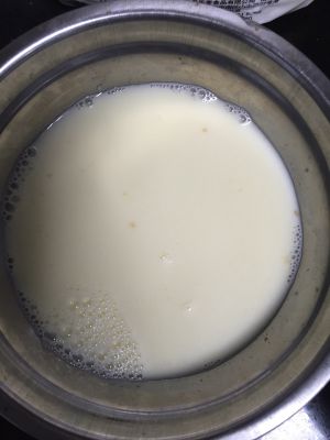 将搅拌好的蛋黄和低粉倒入混合好的牛奶液里。。过程可能很难混合。。耐心点。。