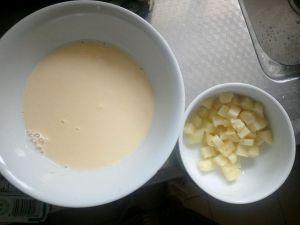 将蛋黄中加入糖,搅拌均匀后加入牛奶,再次搅匀后加入奶粉,搅匀,很多配方用了炼乳或淡奶油,奶味比较浓,可以依据喜好添加,但是给宝宝吃最好不加。做好蛋液后菠萝沥水。