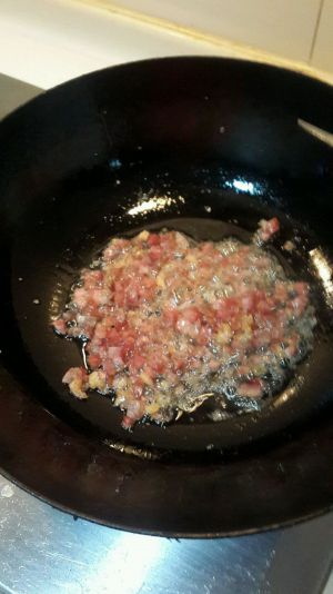 腊肉下锅翻炒(腊肉有点肥肉所以没有另外放油),将拌好的糯米下锅翻炒,加入豌豆,玉米继续翻炒,(心急的这里可以加点水盖上锅盖闷煮一会)炒到糯米熟了就可以出锅了(因为糯米是用美味鲜酱油拌匀的,腊肉也是有咸味的,所以不需要另外放调料了)