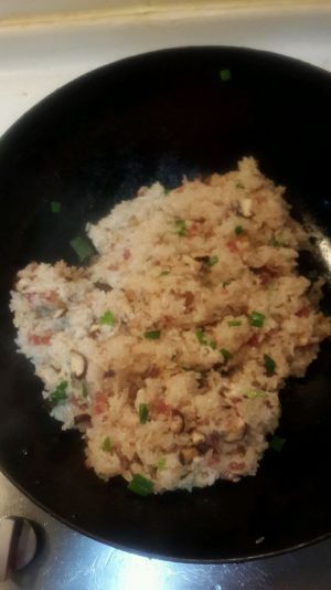 最后加入香菇虾仁香肠葱沫,盐适量,味极鲜适量,翻炒均匀出锅!!
