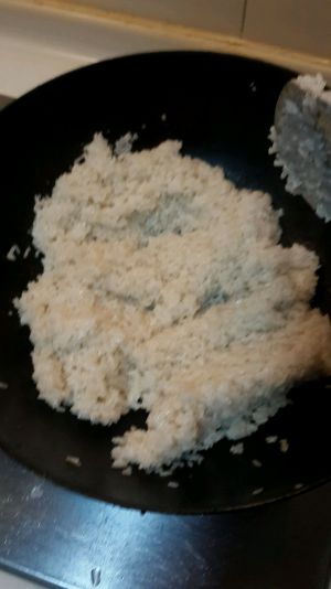 锅烧热,把泡好的糯米倒入国内翻炒!加150毫升开水盖锅盖焖60秒,再翻炒加水!加3次水即可!