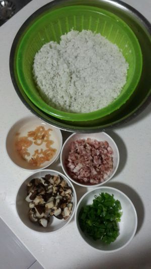糯米提早浸泡,准备好豌豆,玉米,腊肉切丁