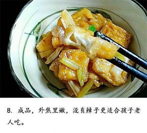 倒入淀粉水勾芡出锅,也可先盛出豆腐,再烧汁皮更焦脆。
