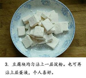 豆腐块均匀粘上一层淀粉,也可以再粘上层蛋液,个人喜好。