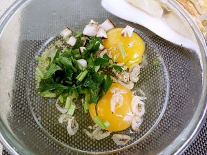 鸡蛋加虾皮,香菇碎,香菜碎,加盐和白胡椒少许,打成蛋液。如果成人吃可以放香葱,小孩子不喜欢放的香菜