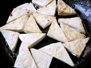 吸去豆腐表面的水分,然后裹上一层干面粉,接下来裹一层蛋液,中小火煎成金黄色的豆腐片后起锅沥干