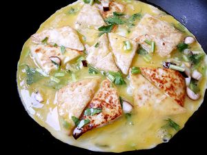 豆腐切片 鸡蛋打散
