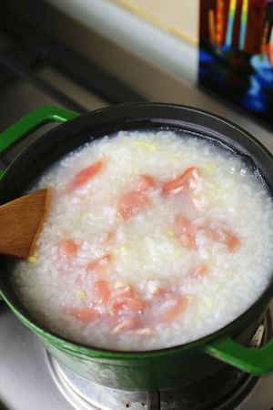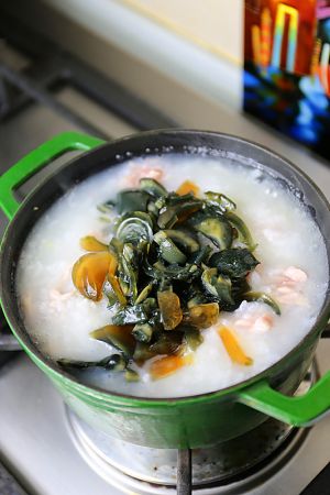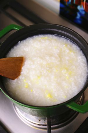 水烧开,加入泡好的大米,大火烧开,转小火煮约半个小时