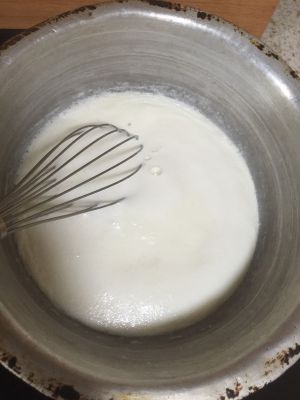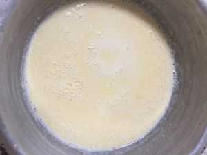 牛奶加糖,搅拌均匀,放奶锅加热至糖融化。放全蛋进去,搅拌均匀。