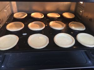烤箱提前预热上下管,190度,烤25分钟(每家的烤箱温度不一定都一样的,如果时间到颜色还是没有上色的蛋挞的话可以调220度烤10分钟上色)
