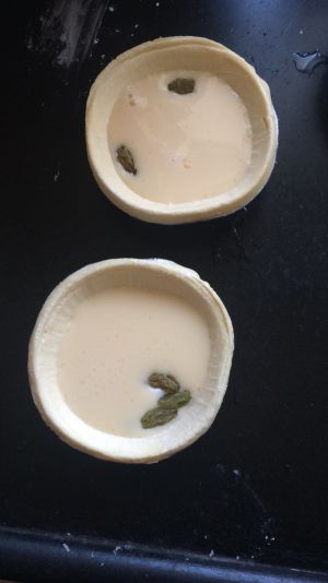 放葡萄干在挞皮里,倒入蛋挞液,预热烤箱15分钟,然后蛋挞入烤箱180度中下层20分钟