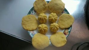 煎之前把南瓜饼底部的糯米粉拍掉 锅中放少许油油温上来以后转小火煎至俩面金黄鼓起就熟啦!