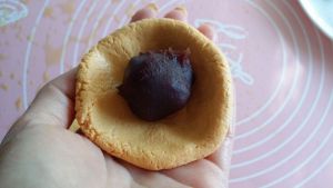 抓一小团,揉好,按扁,加入豆沙馅儿,捏拢,揉圆