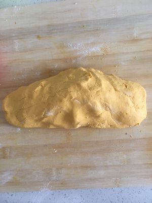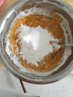 就是把南瓜蒸熟,捏碎,爸爸说捏碎以后要倒掉一些水,那样味道会更浓一点。然后放一定的面粉,在面粉里加南瓜,加糖,拌拌拌。