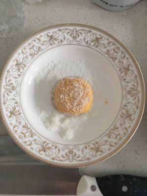 将团好的南瓜饼放入盘中粘上椰蓉-