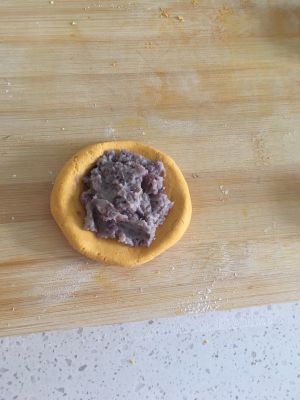 将之前揉好的圆团捏平再放适量的红豆沙。