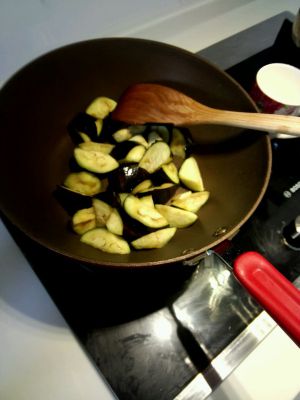 然后炸茄子,茄子软烂就可以了,记得要一直翻炒,要不容易糊