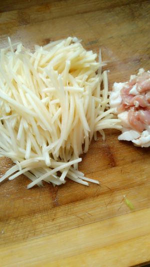 土豆削皮,切丝,这里不要和做酸辣土豆丝一样放水里泡,少了它自身的淀粉就不好吃了。蒜切末,葱切花。