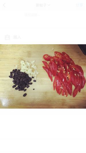 把红椒切碎,在切一些蒜末,再放好一些豆豉