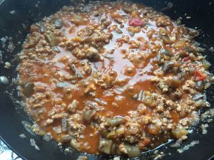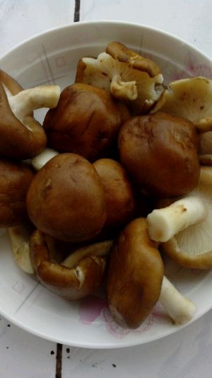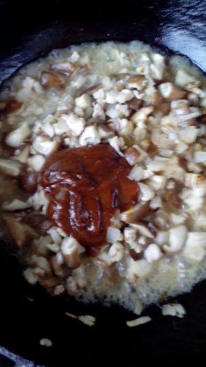 肉陷变色后加入香菇稍微翻炒,再加入甜面酱继续翻炒