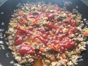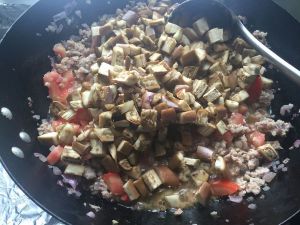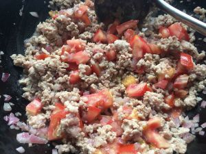 蕃茄炒得差不多就可以放肉末进去翻炒,要把肉末弄散,这样口感会比较好
