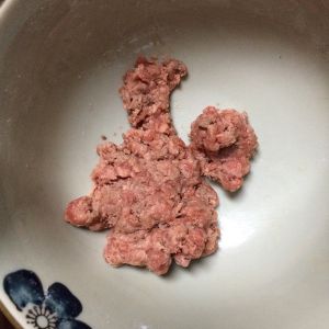 在肉沫中,放入盐、料酒、胡椒粉腌一会儿入味儿。洋葱买两个切丝