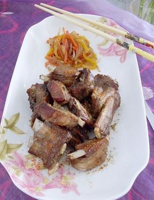 把羊排照着每根肋骨切开,放入锅里加水煮开后用温水洗净,放入高压锅(不盖盖子)加入酱油、香料等(留下辣椒粉、胡椒粉和一半孜然、孜然粉)煮开后(这样肉能上色)再加水(不莫过肉)盖上盖子大火上气小火20分钟。拿出备用