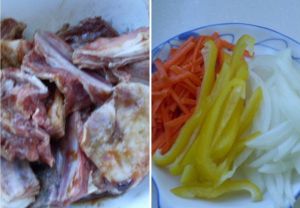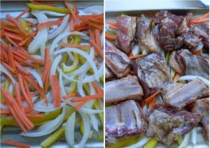 用生抽2茶匙、烤肉酱1茶匙、盐1茶匙、料酒2茶匙、糖1茶匙、黑胡椒半茶匙调成汁,把羊排放在调味汁中腌制一个小时以上。胡萝卜、彩椒、洋葱分别切丝。