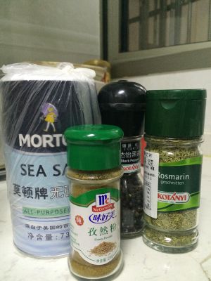 先用葱花,生姜片,生抽,盐,罗勒香料,黑胡椒粉,孜然粉腌制一晚上