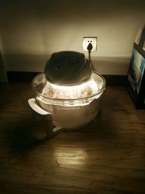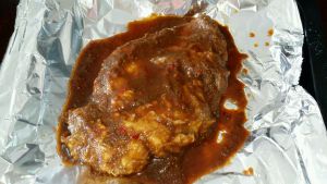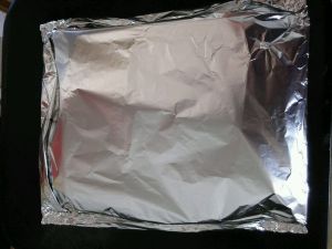再次取出,打开铝纸把汤汁倒出,再次放入光波炉中烘烤,250度10分钟,可打开翻动两面烘烤,注意观察防止烤糊。