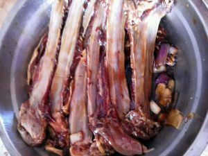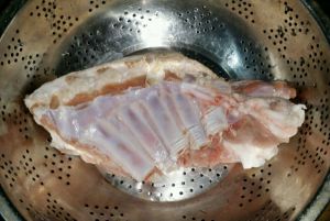 将羊排切成小块,放入盆中沥干血水,用锥子扎眼,方便入味。