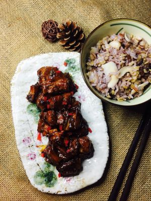 挑选特级肋排(这样浮末少味道好口感棒),也就是超市里比较贵的。冷水下锅大火开锅10分钟后转小火30分钟,捞出来到生抽老抽上色,然后放锅里四面煎熟。