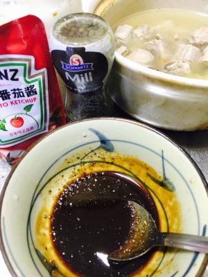 调汁 三勺番茄酱 两勺醋 两勺糖 一勺生抽 因为不放盐所以加一点老抽 也为了上色 一点点胡椒 可以放辣椒